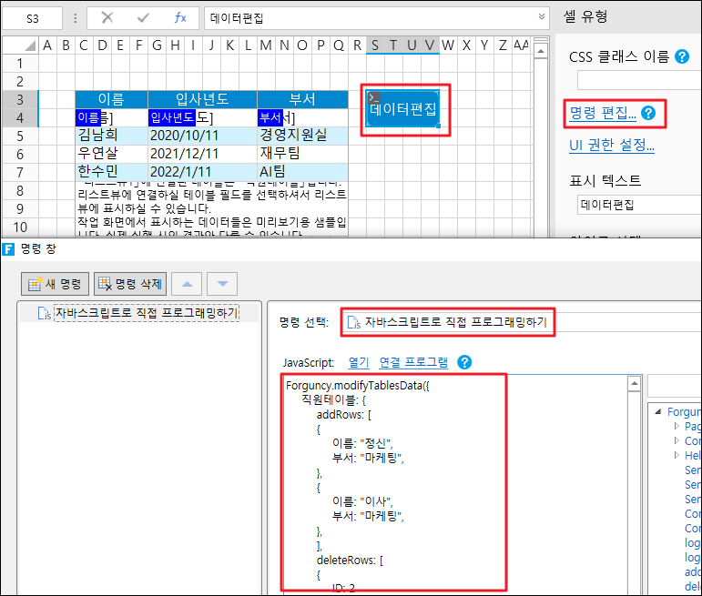 ![](https://help.grapecity.com.cn/download/thumbnails/72364778/%E6%AD%A5%E9%AA%A42.png?version=1\&modificationDate=1648092720000\&api=v2) 페이지에서 셀 범위를 선택하고 셀 유형을 버튼으로 설정하고 명령을 \[JavaScript 명령]으로 편집하고 JavaScript 코드를 입력합니다.