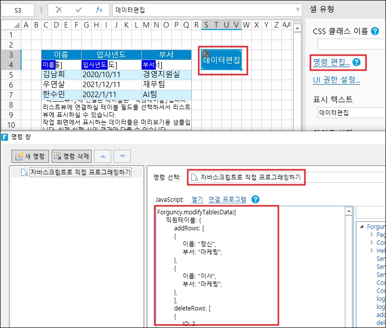 페이지에서 셀 범위를 선택하고 셀 유형을 버튼으로 설정하고 명령을 [JavaScript 명령]으로 편집하고 JavaScript 코드를 입력합니다.