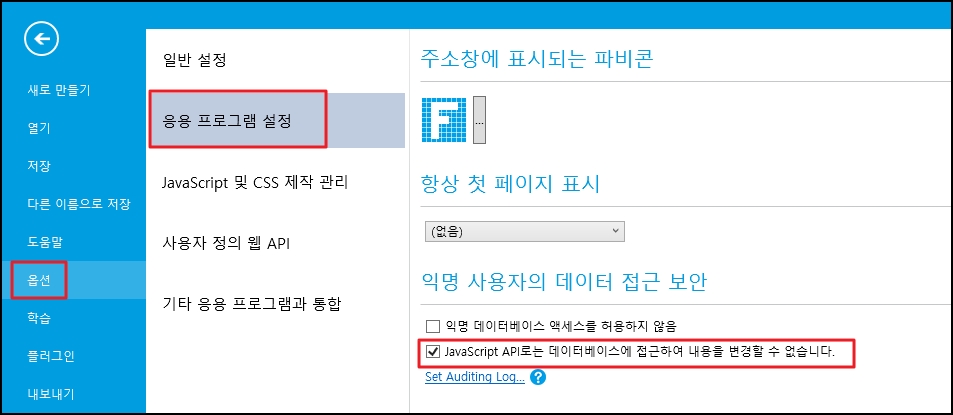 [옵션-> 응용 프로그램 실행]에서 "JavaScript Api를 사용하여 데이터베이스에 접근하여 내용을 변경할 수 없습니다." 선택하면 이 메서드를 사용하여 지정된 데이터 테이블에 데이터를 추가할 때 실패합니다. 이 메서드를 사용 하 여이 메서드를 사용 하 여이 작업을 수행 하기 전에이 옵션을 선택 취소 합니다.
