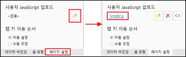 페이지 설정에서 JavaScript 파일 아래의 업로드 아이콘을 클릭하여 JavaScript 파일을 업로드합니다.![]()