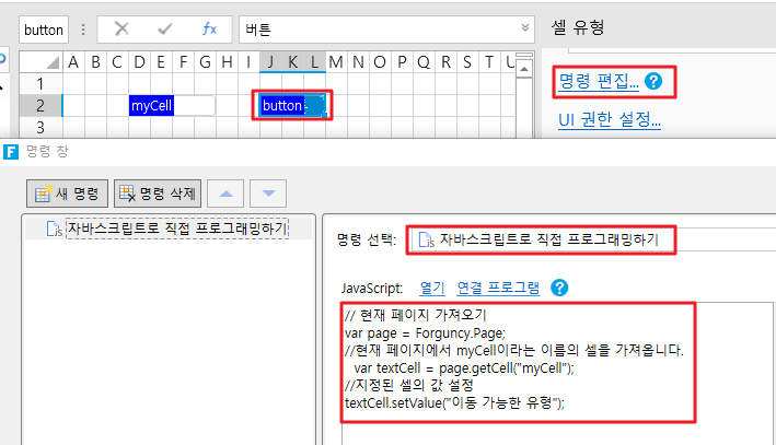 ![](https://help.grapecity.com.cn/download/thumbnails/56532211/%E6%AD%A5%E9%AA%A42.png?version=1\&modificationDate=1611021619000\&api=v2) 셀 범위를 선택하고 셀 유형을 버튼으로 설정하고 명령을 \[자바스크립트로 직접 프로그래밍하기]으로 편집하고 JavaScript 코드를 입력합니다.