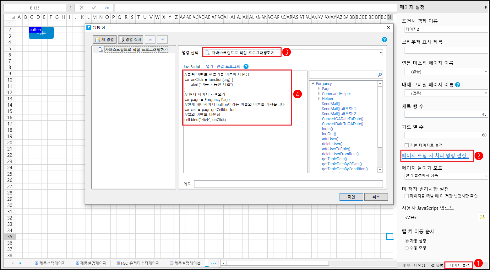 ![](https://help.grapecity.com.cn/download/thumbnails/56532211/%E6%AD%A5%E9%AA%A42.png?version=1\&modificationDate=1611021619000\&api=v2) 페이지 설정에서 \[페이지 로딩 시 명령 편집]을 클릭하고 명령을 JavaScript 명령으로 선택하고 JavaScript 코드를 입력합니다.