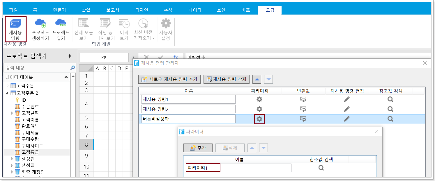 재사용 명령 관리자를 열고 재사 명령이 있는 행을 클릭하여 파라미터 이름을 설정할 수 있습니다.![]()