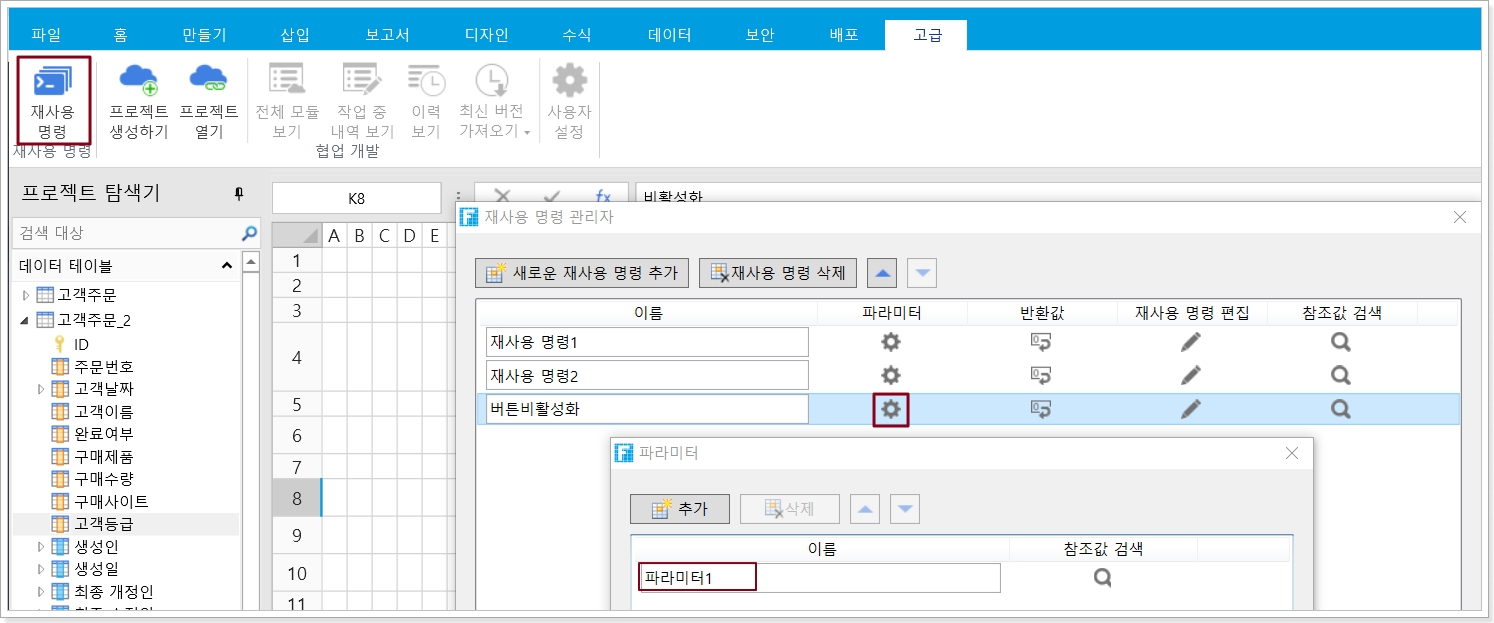 재사용 명령 관리자를 열고 재사 명령이 있는 행을 클릭하여 파라미터 이름을 설정할 수 있습니다.