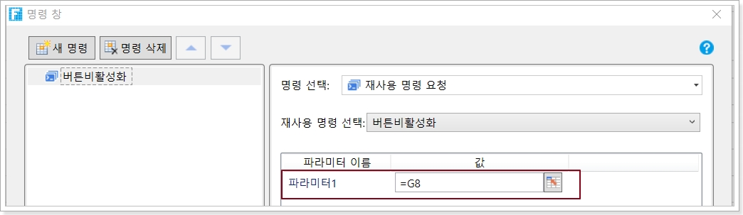 [확인]을 클릭하면 셀 속성 설정 명령의 대상 셀인 [파라미 1]이라는 파라미터가 자동으로 생성됩니다.