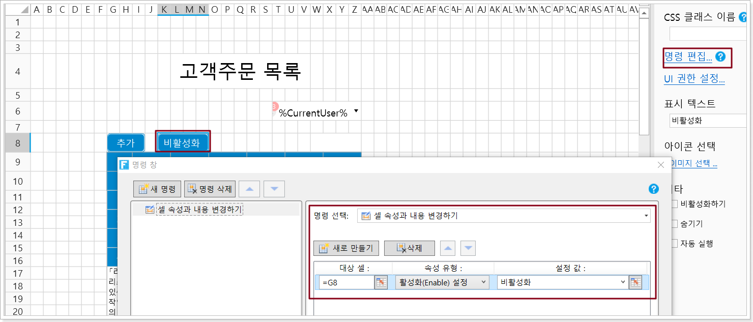 예를 들어 주문 목록 페이지에서 비활성화 단추를 설정하고, 해당 명령을 편집하여 [셀 속성과 내용 변경하], 대상 셀은 버,튼 셀 속성은 [활성화 설정]이고 설정값 비활성화합니다.