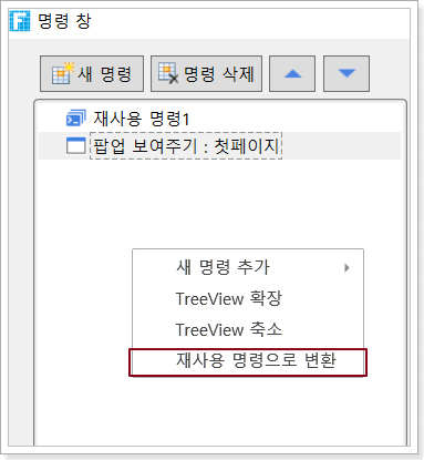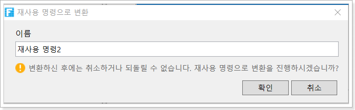 [재사용 명령으로 변환]을 선택하면 재사 명령으로 변환 대화 상자가 나타납니다. 변환된 재사용 명령은 원래 명령을 대체하므로 주의해서 수행합니다.