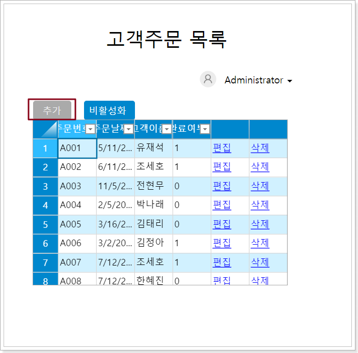 페이지를 실행하고 주문 목록 페이지에서 비활성화 버튼을 클릭하면 추가 버튼이 비활성화됩니다