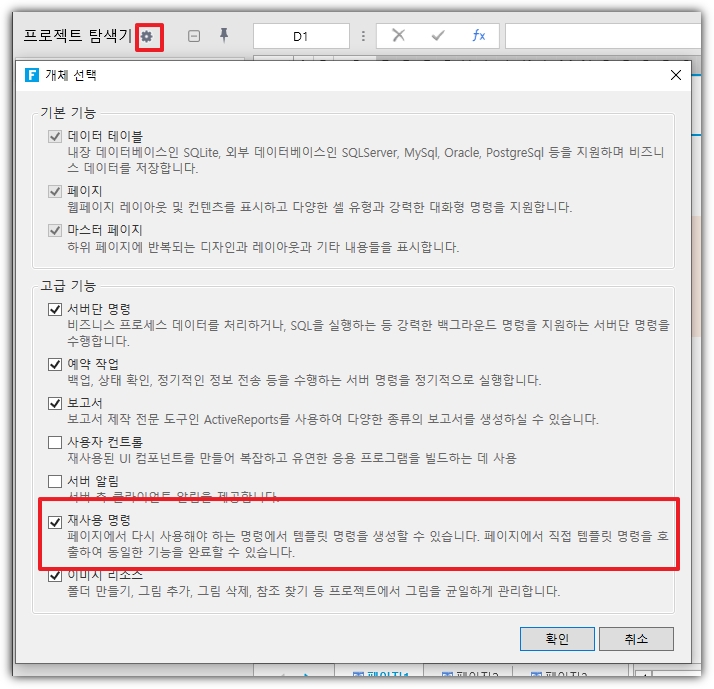 재사용명령 기능은 기본적으로 개체 관리자에 표시되지 않는 고급 기능입니다.재사용 명령 앞의 체크박스를 선택하고 "체크"를 클릭하면 개체 관리자에 재사용명령이 표시됩니다.