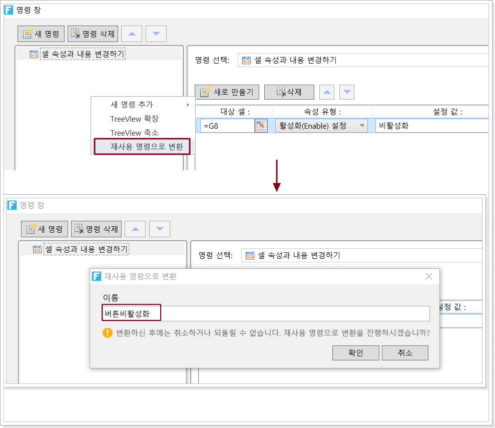 [재사용 명령으로 변환]을 선택하고 재사용 명령 생성 대화 상자에서 재사용 명령의 이름을 [버튼 비활성화]로 설정합니다.