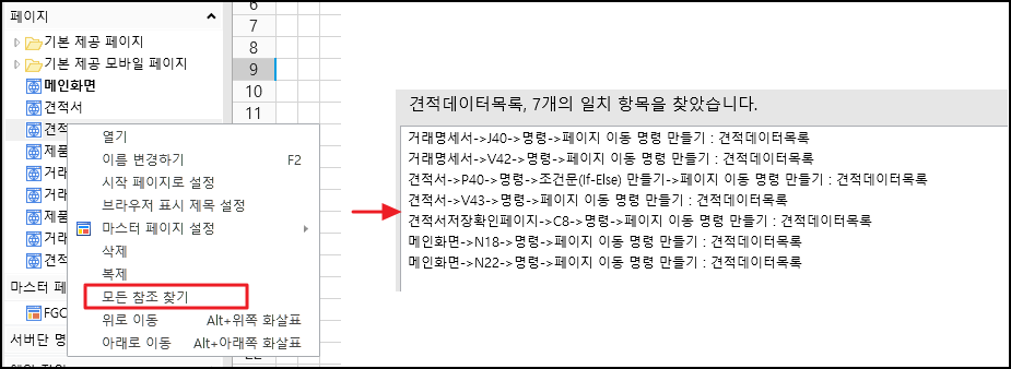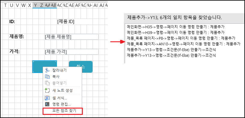참조를 찾을 셀을 선택하고 마우스 오른쪽 버튼을 클릭하고 마우스 오른쪽 버 클릭 메뉴에서 모든 참조 찾기를 선택하면 디자이너 아래에 찾은 참조가 표시되고 검색된 참조를 두 번 클릭하면 해당 셀을 참조하는 요소로 이동합니다.