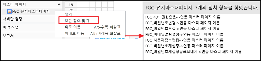 참조를 찾을 마스터 페이지를 선택하고 마우스 오른쪽 버튼을 클릭하고 마우스 오른쪽 버튼 클릭 메뉴에서 모든 참조 찾기를 선택하면 디자이너 아래에 검색된 참조가 표시되고 검색된 참조를 두 번 클릭하면 마스터 페이지를 참조하는 요소로 이동합니다.