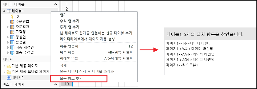 참조를 찾을 데이터 테이블을 선택하고 마우스 오른쪽 버튼을 클릭하고 마우스 오른쪽 버튼 클릭 메뉴에서 모든 참조 찾기를 선택하면 하단에 검색된 참조가 표시되고 검색된 참조를 두 번 클릭하면 해당 데이터 테이블을 참조하는 요소로 이동합니다.