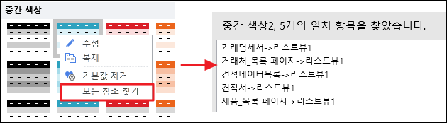 참조를 찾을 테이블 스타일을 선택하고 마우스 오른쪽 버튼을 클릭하고 마우스 오른쪽 버튼 클릭 메뉴에서 모든 참조 찾기를 선택하면 디자이너 아래에 찾은 참조가 표시되고 검색된 참조를 두 번 클릭하면 테이블 스타일을 참조하는 요소로 이동합니다.