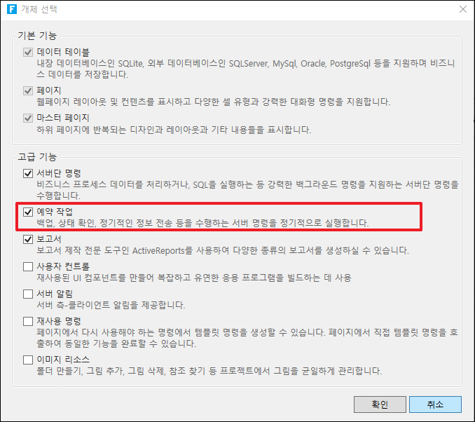 버튼을 클릭하면, 개체선택 창이작뜹니다. 개체선택창에서 예약작업의 확인란을 선택하고 "확인"을 클릭하면 개체 관리자에 예약된 작업이 표시됩니다.