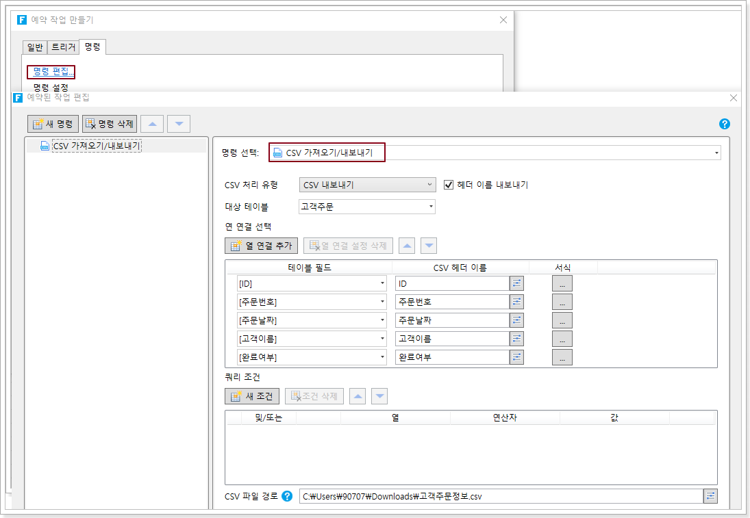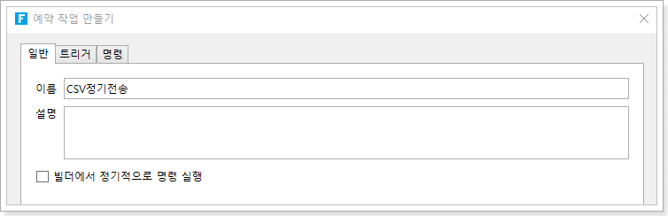 예약된 작업에 의해 실행되는 명령을 편집합니다. [명령 편집] 하이퍼링크를 클릭하고 예약된 작업 편집 대화 상자를 표시하고 CSV 가져오기/내보내기를 선택합니다.