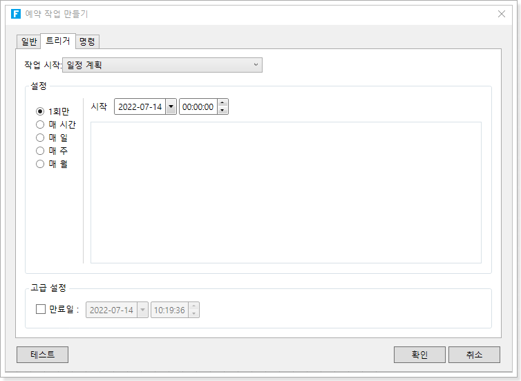 일정 계획: 실행 빈도를 한 번/매시간/일별/주별/월별로 설정하고 고급 설정에서 만료 날짜를 설정할 수 있습니다.