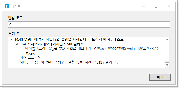 테스트 버튼을 클릭하면 예약된 작업의 명령이 즉시 실행됩니다. 예약된 작업에서 명령을 실행하면 테스트 결과가 표시됩니다. 결과에는 "반환 코드" 및 "로그"가 포함됩니다.