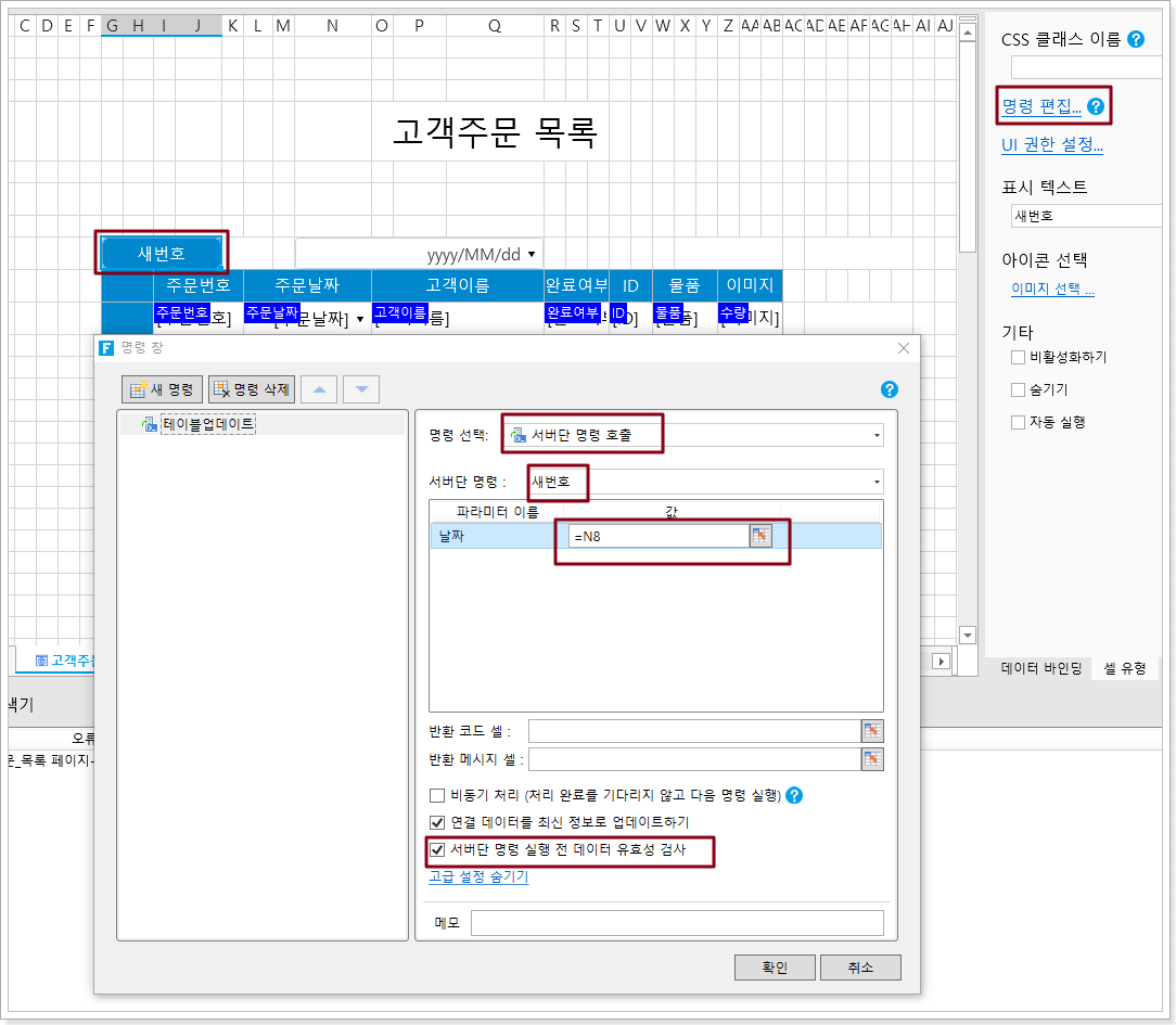 설정 완료되면 페이지 측에서 이 서버단 명령을 호출할 수 있습니다. 셀 범위를 선택하고 버튼을 설정합니다. 버튼의 명령을 편집하고 "서버단 명령 호출"으로 명령을 선택한 다음 서버단 명령 뒤에 있는 드롭다운을 클릭하고 드롭다운 목록에서 "서버단 명령 실행 전 데이터 유효성 검사"를 선택합니다.