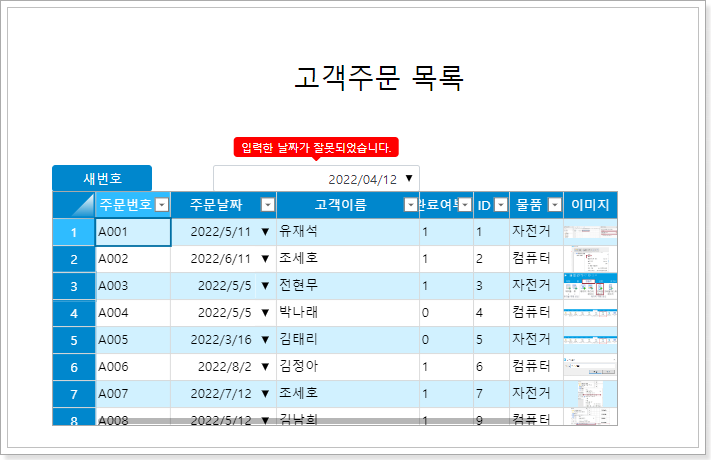 페이지를 실행하고 날짜 셀에서 날짜를 선택한 다음 새번호를 클릭하여 서버 쪽 명령을 실행하면 요청을 보내기 전에 데이터 유효성 검사가 수행됩니다. 셀의 날짜가 설정된 유효성 검사 기준을 충족하지 않는 것을 볼 수 있습니다.