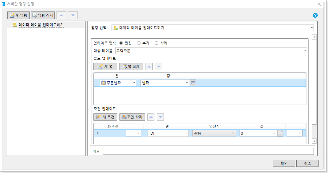 명령은 데이터 테이블 작업업데이트하기로 선택한다. 작업 유형은 편집, 대상 테이블은 고객주문, 업데이트 필드는 주문 날짜, 값은 파라미터인 날짜, 업데이트 조건은 업데이트 ID가 3인 데이터입니다.