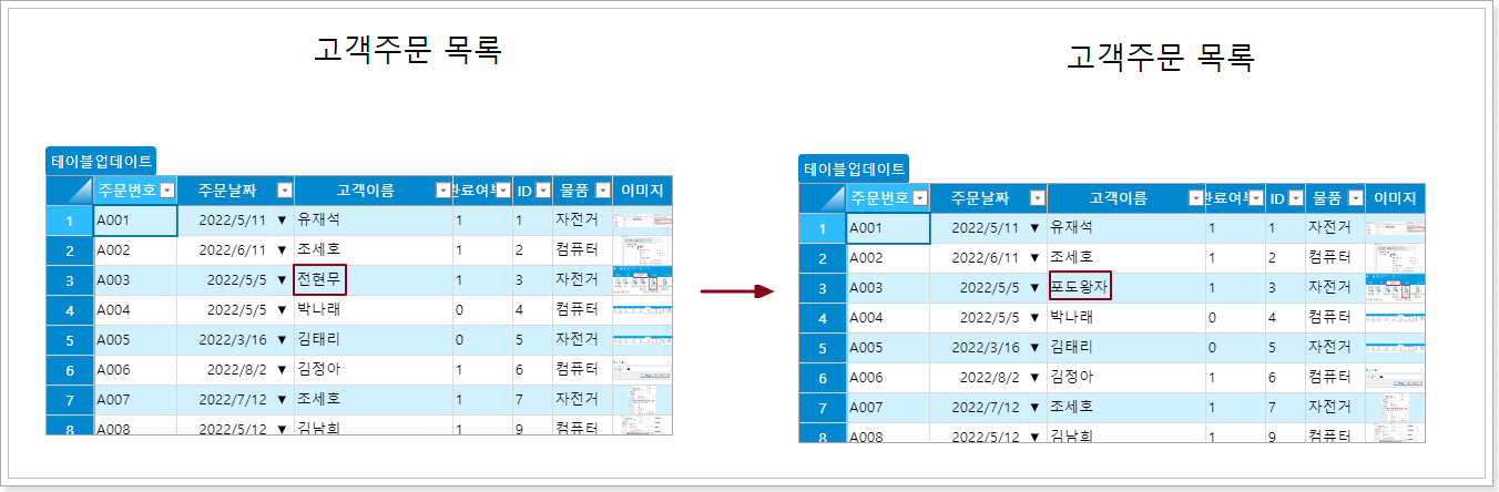 페이지를 실행합니다.페이지에서 데이터 테이블 업데이트 버튼을 클릭하면 서비스 쪽에서 데이터 테이블 업데이트가 수행됩니다. ID 3 레코드에서 고객 이름이 전현무에서 포도왕자로 업데이트된 것을 볼 수 있습니다.