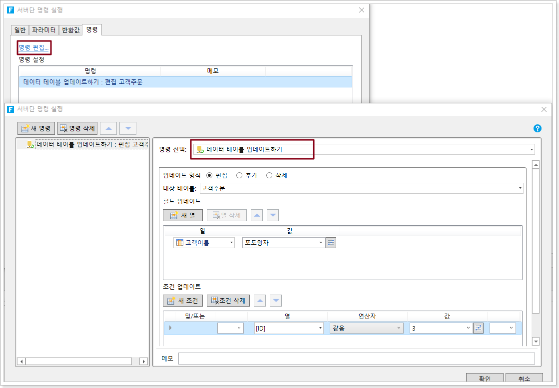 예를 들어 "데이터 테이블 업데이트"라는 이름의 서버단 명령을 만들고, "데이터 테이블 업데이트하기 명령"을 선택하고 작업유형은 "편집"을 클릭한다. 대상 테이블은 "고객주문"이고, "필드 업데이트에는 고객이름" 필드를 "포도왕자"로 설정한다. 또한 조건 업데이트에는 ID는 3과 같음으로 설정한다.