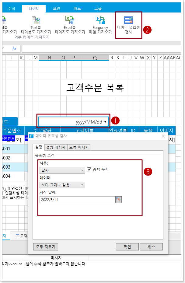 파라미터 날짜의 값을 페이지의 셀로 설정하고 고급 설정 표시를 클릭하면 요청 전 데이터 유효성 검사 옵션이 기본적으로 선택되어 있음을 알 수 있습니다.