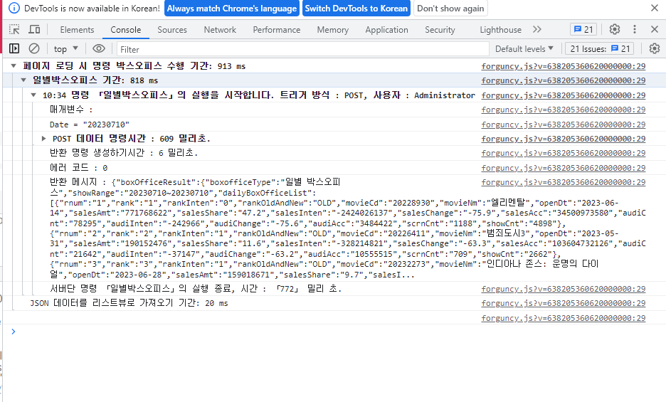 서버단 명령을 만든 후 페이지 측에서 서버단 명령을 호출할 수 있습니다. 서버단 명령이 요청을 전송하여 실행을 트리거하면 브라우저의 콘솔에 로그 정보가 자동으로 표시됩니다. 브라우저에서 F12 키를 눌러 개발자 도구를 열어 콘솔의 정보를 볼 수 있습니다.