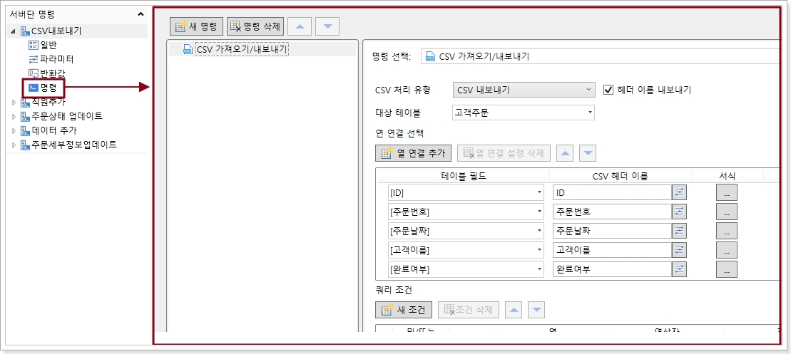 서버단 명령에서 앞에 있는 확장 버튼을 클릭하고 명령을 두 번 클릭하면 서버 명령 편집 대화 상자가 나타납니다.