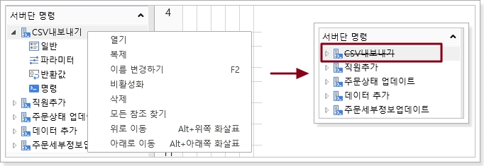 서버단 명령의 상태가 비활성화된 경우 이 명령을 마우스 오른쪽 버튼을 클릭하고 활성화를 선택하여 명령의 상태를 사용으로 변경합니다.