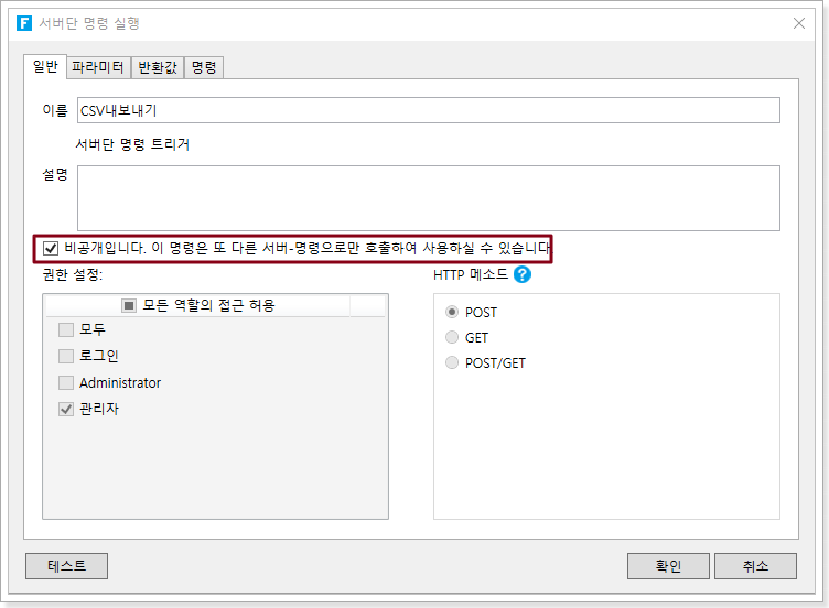 서버단 명령을 만들 때 일반 설정 탭에서 사용 범위를 설정할 수 있으며, "비공개"를 선택하면 서버단 명령이 페이지 측에서 직접 호출되지 않으며 다른 서버단 명령에서만 호출할 수 있습니다.