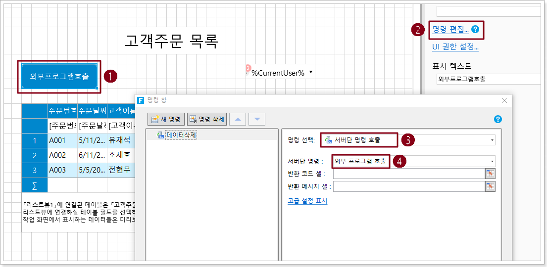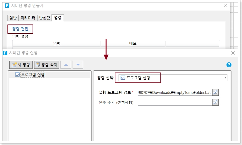 서버 명령을 편집하는 명령입니다. [명령 편집] 하이퍼링크를 클릭하고 서버 명령 편집 대화 상자를 표시하고 프로그램 호출 명령을 선택합니다.