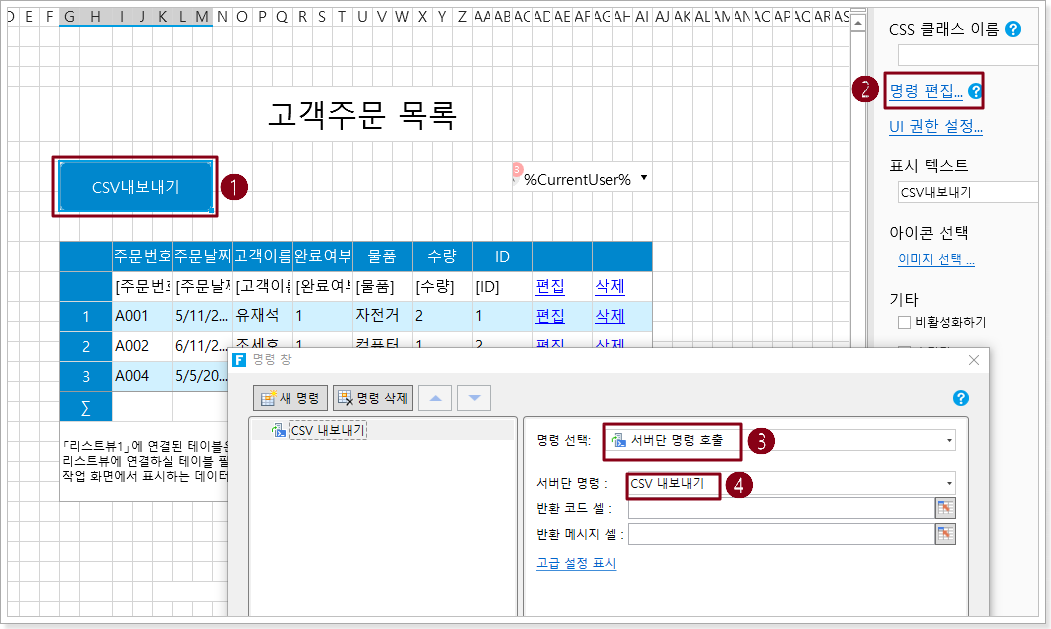 예를 들어 페이지에서 셀 범위를 선택하고 버튼을 설정합니다. 버튼의 명령을 편집하고 "서버단 명령 호출"으로 명령을 선택한 다음 서버단 명령 뒤에 있는 드롭다운을 클릭하고 드롭다운 목록에서 "CSV 내보내기"를 선택합니다.