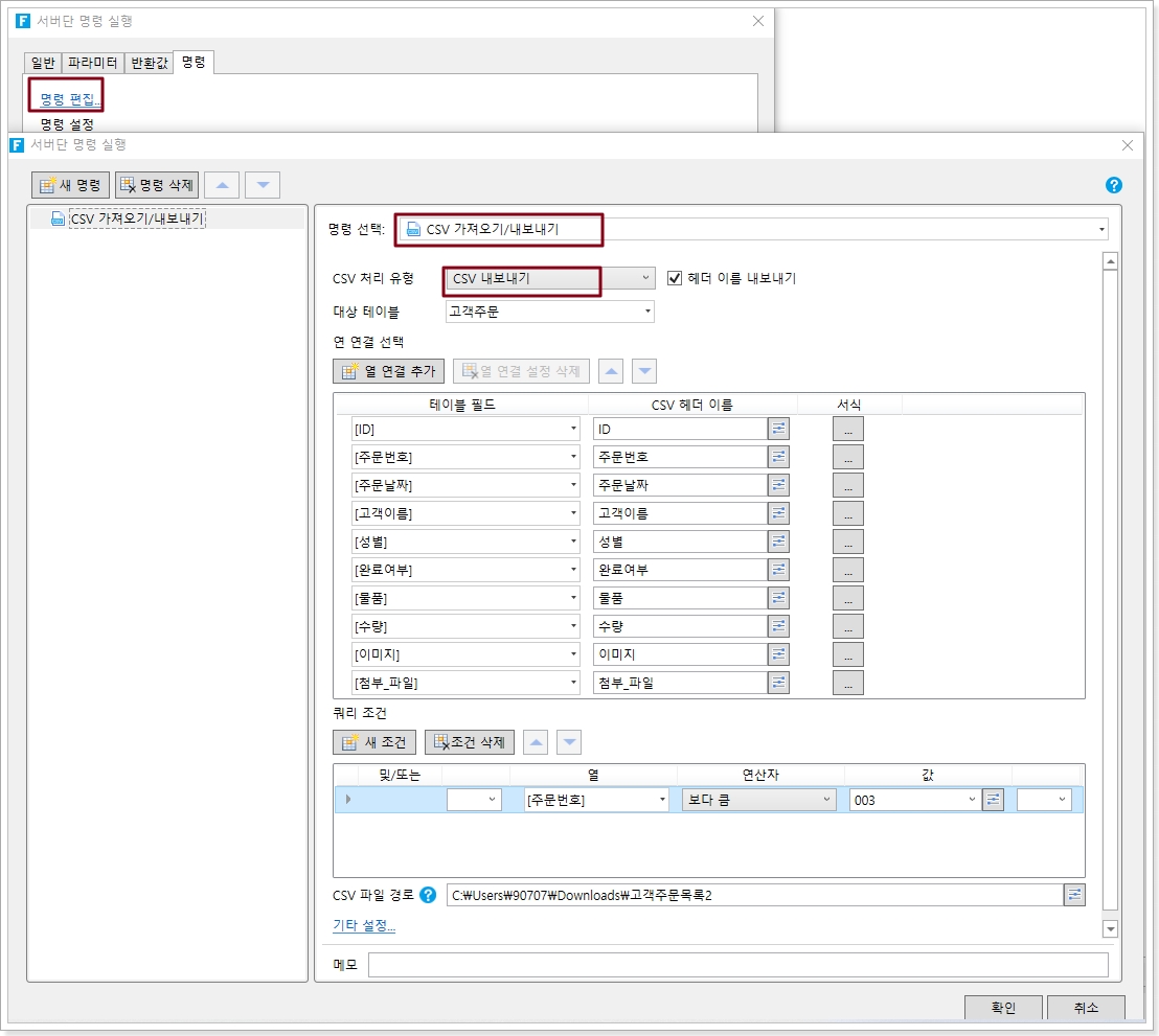 서버단 명령을 편집하는 명령입니다. [편집 명령] 하이퍼링크를 클릭하고 서버 명령 편집 대화 상자를 표시하고 서버 가져오기 내보내기 CSV 명령을 선택합니다. 명령 설정은 아래 표에 나와 있습니다.