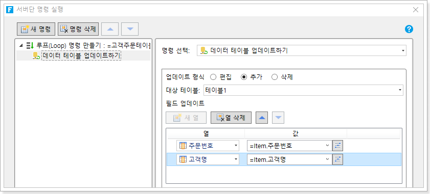 루프의 하위 명령을 "데이터 테이블 업데이트하기"로 선택하고 작업 유형은 추가되고 대상 테이블은 테이블 1입니다.