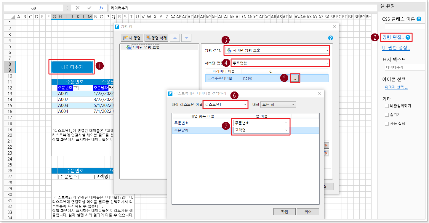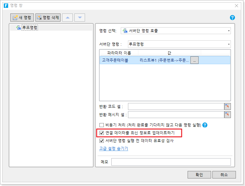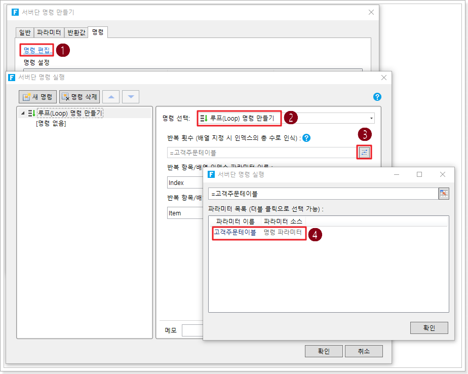 서버단 명령을 편집하는 명령입니다. [명령 편집] 하이퍼링크를 클릭하고 서버단 명령 실 대화 상자를 표시하고 명령선택에서 "루프 명령 만들기"를 선택합니다.