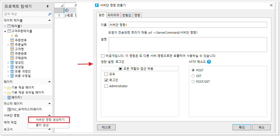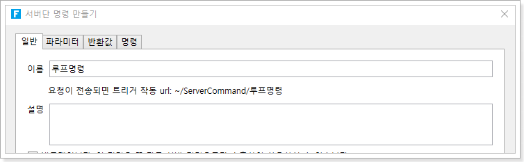 개체 관리자의 서버단 명령 탭을 마우스 오른쪽 버튼을 클릭하고 [서버단 명령 생성하기]를 선택하여 서버단 명령 만들기 대화 상자를 나타납니다.
