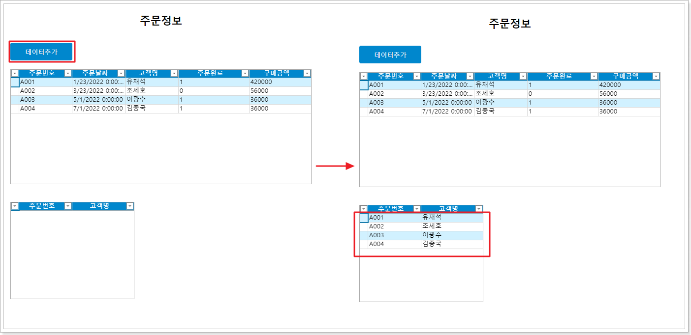 설정이 완료되면 확인을 클릭하여 대화 상자를 닫고 페이지를 실행합니다,페이지에서 데이터 추가 버튼을 클릭하면 서버는 반복 명령의 데이터 테이블 작업 명령을 실행하여 주문 테이블의 각 행에 대해 기록된 주문 번호와 고객 이름 필드 루프를 테이블 1에 추가합니다.