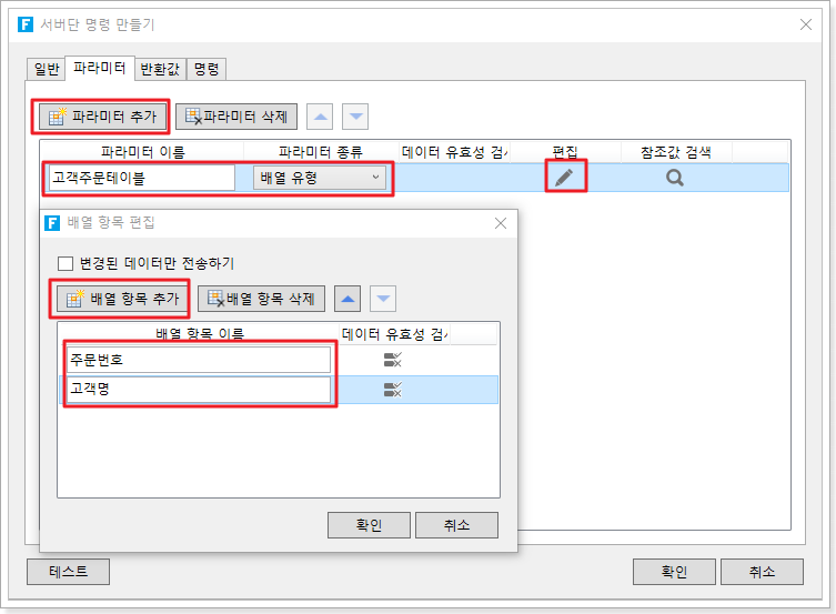 서버 명령의 파라미터를 편집합니다. 배열 형식의 파라미터 "고객 주문 테이블"을 추가하고 두 개의 배열 항목을 추가합니다.
