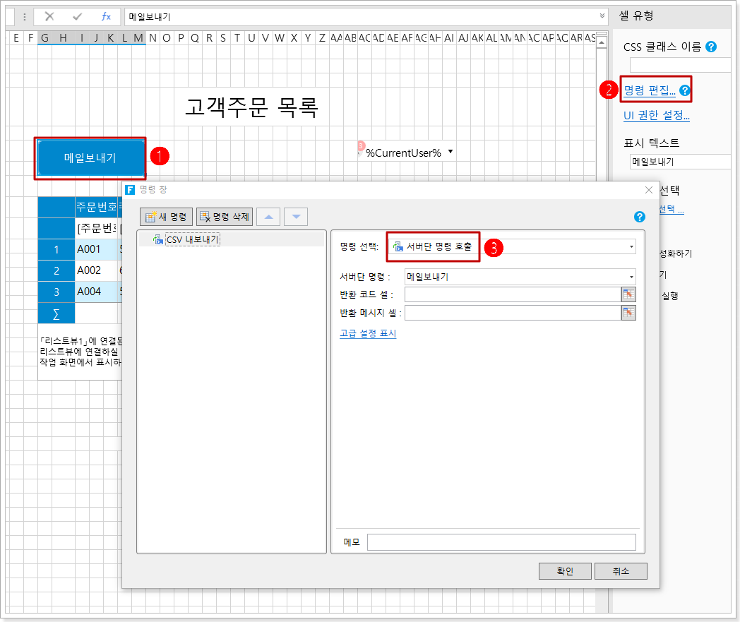 페이지에서 셀 범위를 선택하고 버튼 설정합니다. 버튼의 명령을 편집하고 명령을 "서버단 명령 호출"으로 선택한 다음 서버단 명령 드롭다운 버튼을 클릭하고 드롭다운 목록에서 "메일보내기"를 선택합니다.
