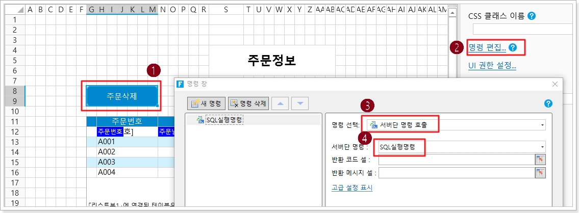 예를 들어 페이지에서 셀 범위를 선택하고 버튼을 설정합니다. 버튼의 명령을 편집하고 "서버단 명령 호출"으로 명령을 선택한 다음 서버 쪽 명령 뒤에 있는 드롭다운을 클릭하고 드롭다운 목록에서 "SQL 실행 명령"을 선택합니다.