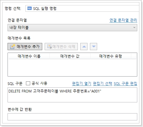 서버단 명령을 편집하는 명령입니다. [명령 편집] 하이퍼링크를 클릭하고 서버 명령 편집 대화 상자를 표시하고 명령을 [SQL 실행 명령]으로 선택합니다.