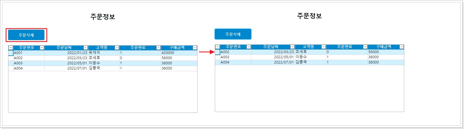 설정이 완료되면 [확인]을 클릭하여 대화 상자를 닫습니다. 페이지를 실행합니다.주문 삭제 버튼을 클릭하면 서버단 명령이 호출되고 SQL 작업이 수행되어 주문 번호 A001의 주문이 삭제됩니다.