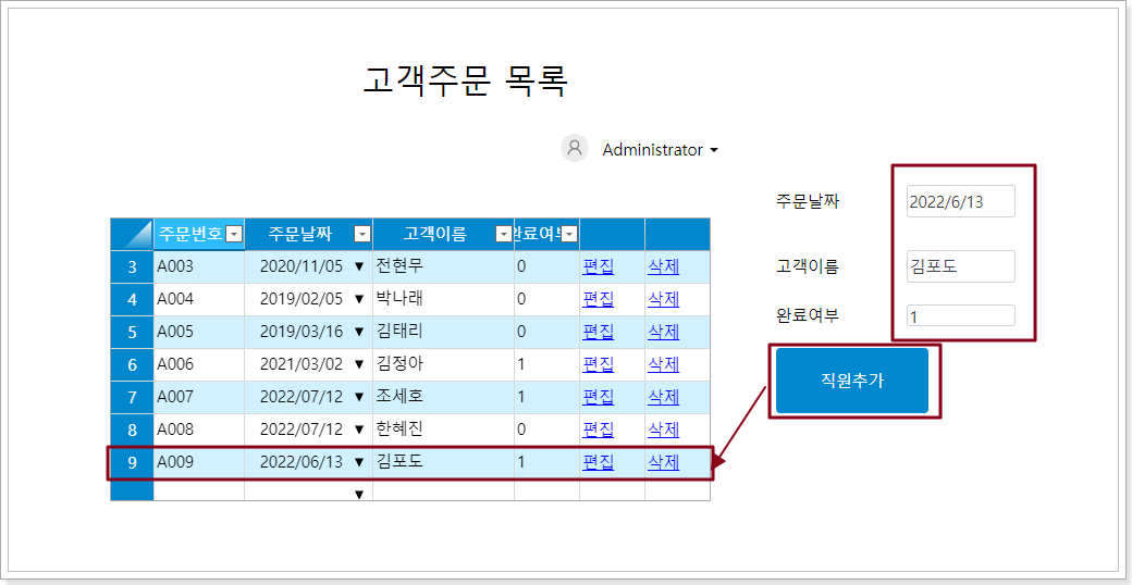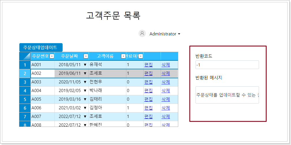 실행 후, 주문상태업데이트를 클릭하면 오른쪽에 반환값이 나오는 것을 확인할 수 있습니다.