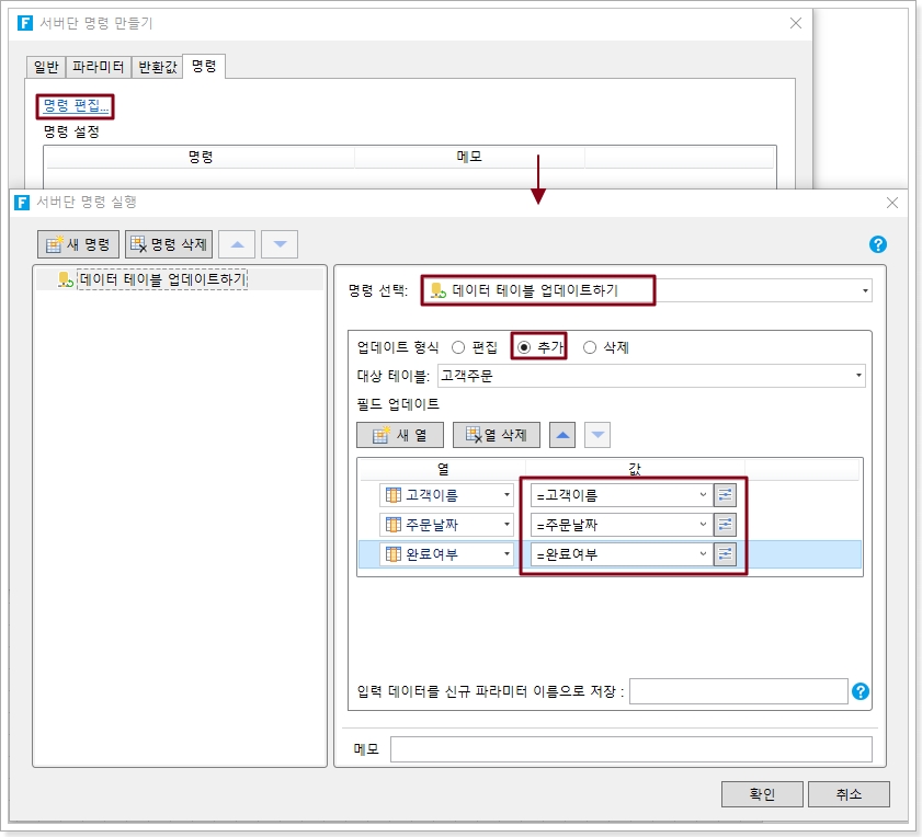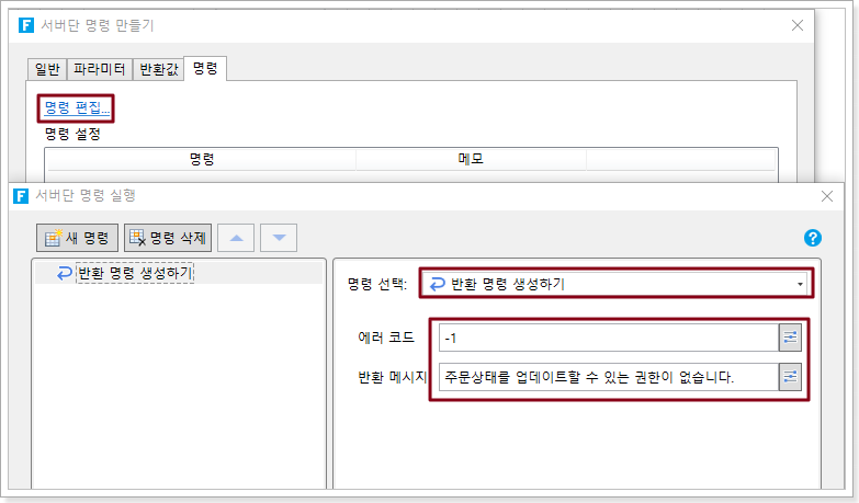 예를 들어 "주문 상태 업데이트"라는 이름의 서버 명령을 만들고 서버단 명령의 이름을 설정한 후 명령을 직접 편집할 수 있습니다.