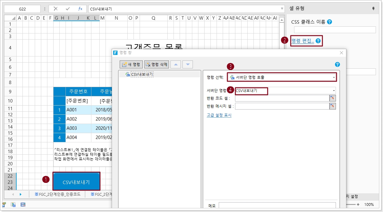 설정이 완료되면 이 서버 명령을 호출할 수 있습니다.예를 들어 페이지에서 셀 범위를 선택하고 버튼을 설정합니다. 버튼 명령을 편집하고 "서버단 명령 호출"로 명령을 선택한 다음 서버 쪽 명령 뒤에 있는 드롭다운을 클릭하고 드롭다운 목록에서 "CSV 내보내기"를 선택합니다