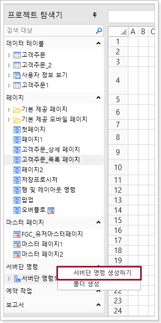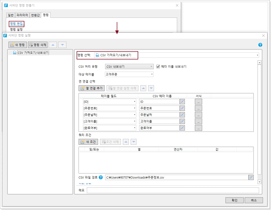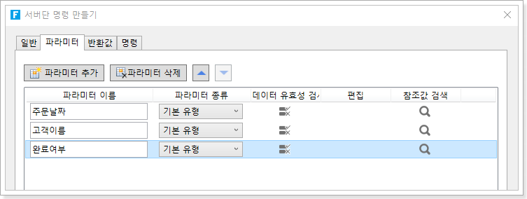서버단 명령은 파라미터를 설정하지 않고 서버 명령의 이름을 설정한 후 명령을 직접 편집할 수 있습니다.