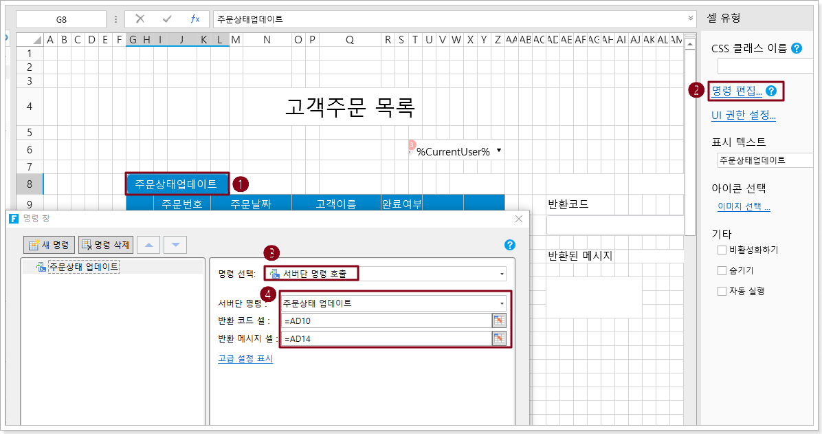 설정이 완료되면 이 서버단 명령을 호출할 수 있습니다.예를 들어 페이지에서 셀 범위를 선택하고 버튼을 설정합니다. 버튼의 명령을 편집하고 "서버 쪽 명령 호출"으로 명령을 선택한 다음 서버단 명령의 드롭다운을 클릭하고 드롭다운 목록에서 "주문 상태 업데이트"를 선택합니다.