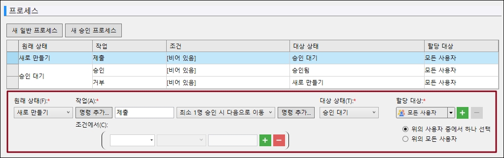 워크플로우에 나타날 수 있는 모든 상태를 설정합니다. 이러한 "상태"는 프로세스의 각 단계에서 "원래상태" 및 "대상 상태"에 사용됩니다.